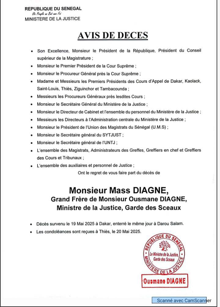 Le Syndicat des Travailleurs de la Justice (SYTJUST) présente ses sincères condoléances à Monsieur le Ministre de la Justice, Garde des Sceaux suite au rappel à Dieu de son frère Mass DIAGNE. En cette douloureuse circonstance, le SYTJUST exprime sa profonde compassion et sa solidarité à Monsieur le Ministre ainsi qu’à sa famille éplorée. Qu’Allah, dans Sa miséricorde infinie, accueille le défunt en son Paradis éternel et apaise les cœurs affligés. À Dieu nous appartenons et à Lui nous retournons.